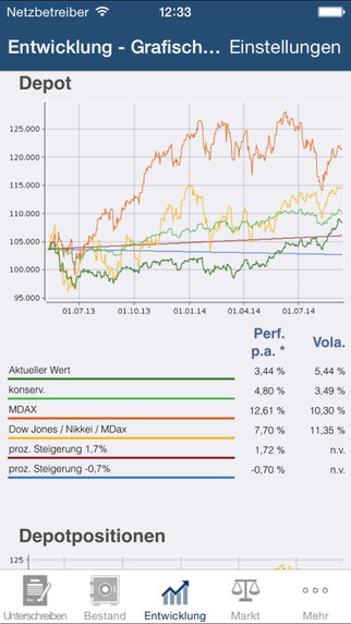 Einmal im Quartal erhalten Sie eine ausführliche Beschreibung der Entwicklung an den Kapitalmärkten. Ob Renten, Zinsen, Währungen, Rohstoffe oder Aktienmärkte. Bleiben Sie mit Ihrer Depotblick-App bestens informiert und nutzen Sie die neutralen Marktkommentare für Ihre Anlagestrategie und den Dialog mit Ihrem Finanzberater.